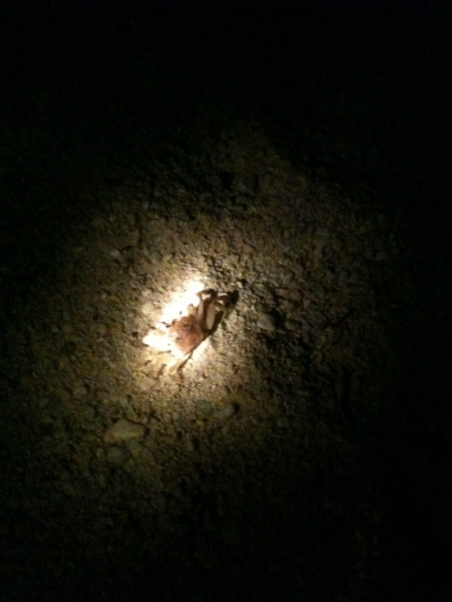 Como a las 8 salimos del campamento base, con nuestra linterna que resulta ser un mojón y no ilumina nada de nada. Menos mal que el resto lleva las suyas que funcionan como debe ser y además el guía lleva un foco de discoteca que ilumina media pista de aterrizaje. Mientras caminamos por la pista precisamente nos paramos de repente, pues encontramos una rana muy diferente de las que vemos en España. De hecho se parece mucho a esas que todos los libros dicen que no toques porque son hipervenenosas, de un color verde brillante…