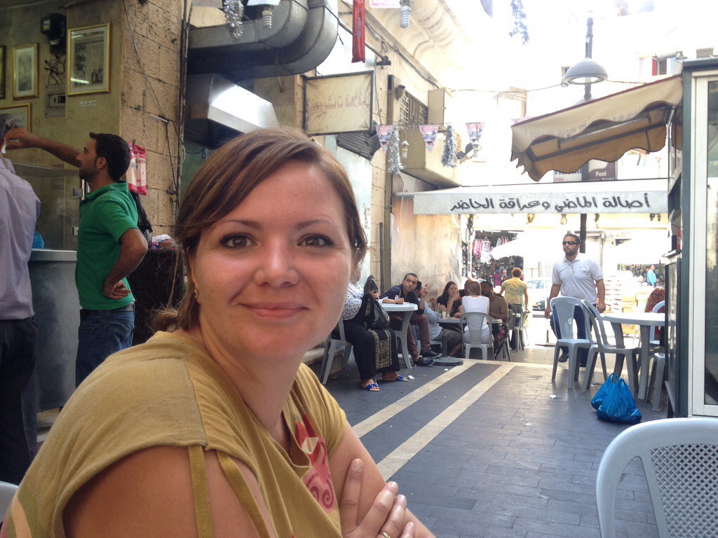 Para descansar un poco nos vamos en busca de Hashem, un sitio famoso porque dicen hacer el mejor humus y falafel. Nada mas llegar pillamos una mesa, aparece un camarero bastante simpatico alq ue le entendemos humus, falafel, «frais» y poco mas. Le decimos que Ok. Ahí, vivendo al límite. Asi que aparece con falafel, humus, patatas fritas, pan, tomate, y trozos de cebolla con su piel y tó, pepino y beans con garbanzos. Y dice, «typical menu». Pues nada, a comer. :)