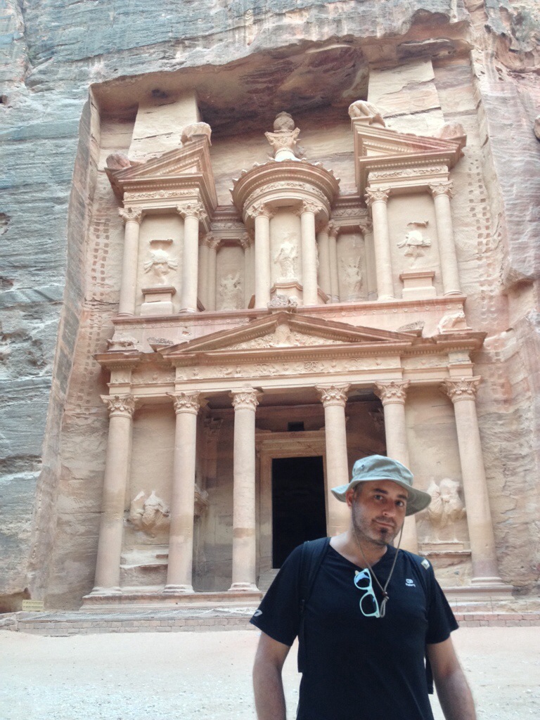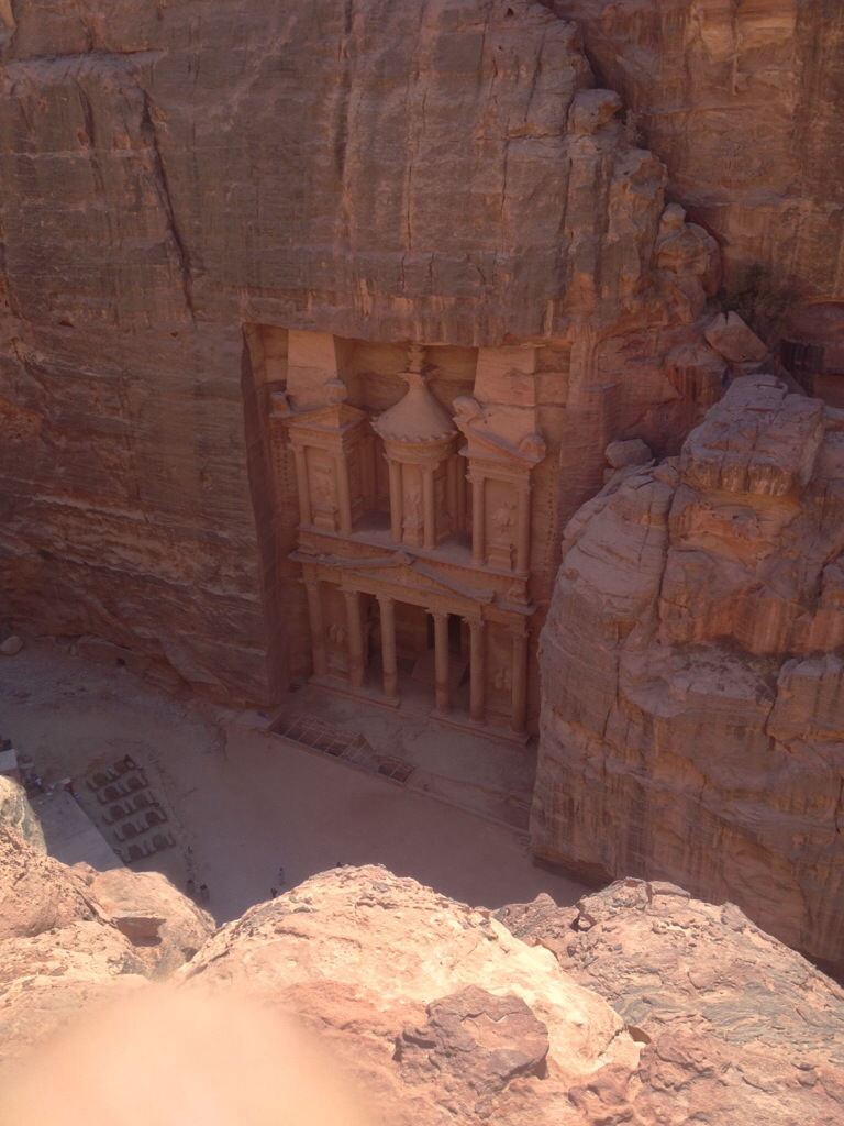 Durante media hora más vamos paseando cuesta abajo entre lo que podría ser un pequeño cañón hasta que llegamos a un saliente donde hay una especie de jaima y dos beduinos beben te con dos guiris. Nos ofrecen tomar un poco pero ya se marchan así que nos dejan la jaima para nosotros y disfrutamos de las mejores vistas que podíamos imaginar del Tesoro. Desde arriba pueden apreciarse todos los detalles de su fachada y ver como existen escalinatas que incluso van alrededor de la montaña como sí te llevaran a la misma cúpula. También, por la perspectiva, vemos que las obras que hay justo delante enterradas en la tierra parecen ser parte de la fachada que aún continúa enterrada.