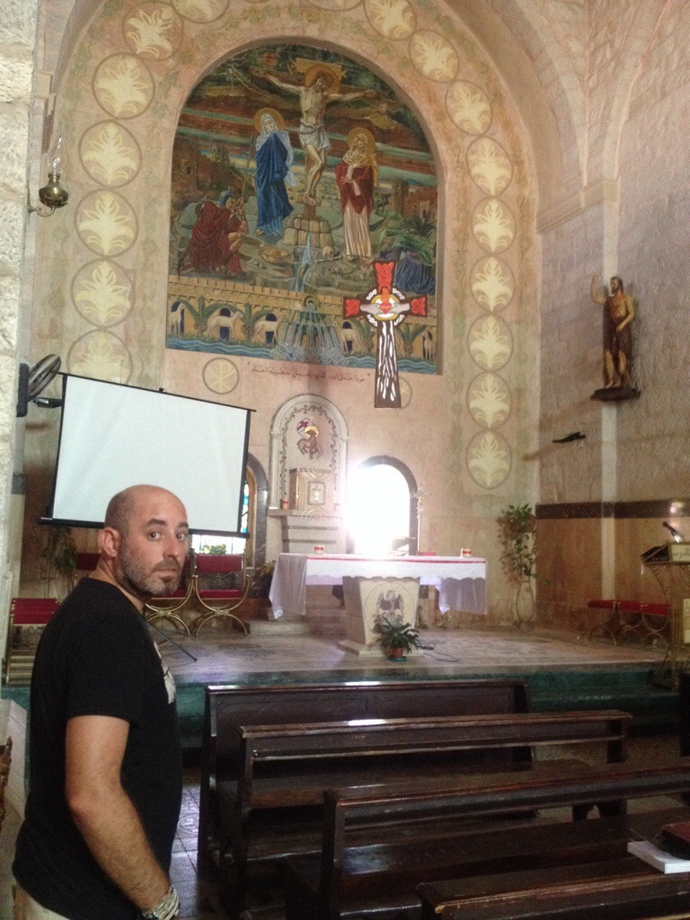Vamos hasta la mezquita u desde allí a la única iglesia cristiana de Madaba, san Juan Bautista. Por 1 JOD entramos y vemos la iglesia el campanario y las catacumbas que son los cimientos de la antigua iglesia bizantina sobre la que se erige la actual iglesia.