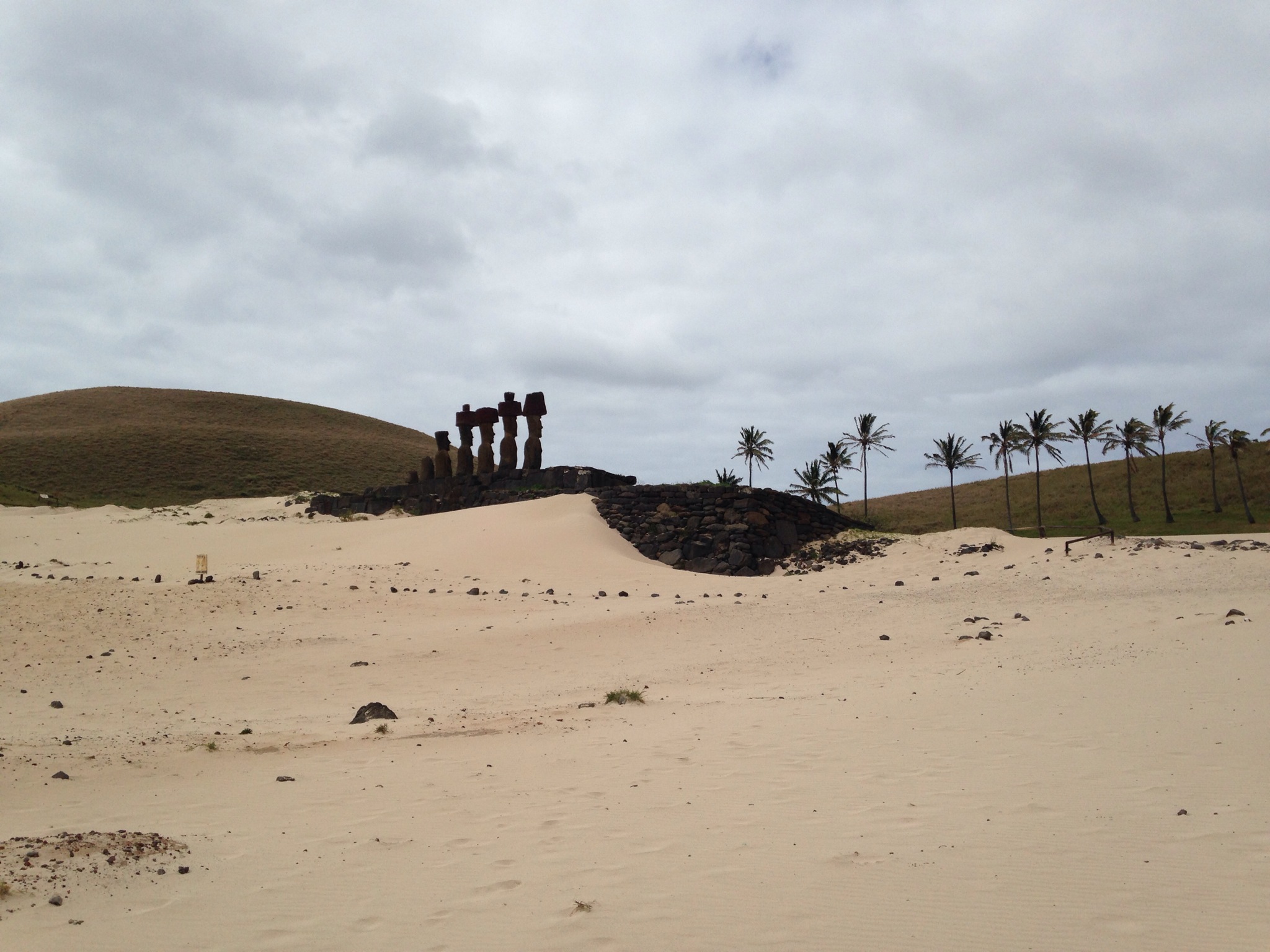 En la arena hay una plataforma (Ahu) con una serie de Moáis y un poco más arriba otro Moái solo que esta destacado por ser el primer Mohai que se puso de pie.