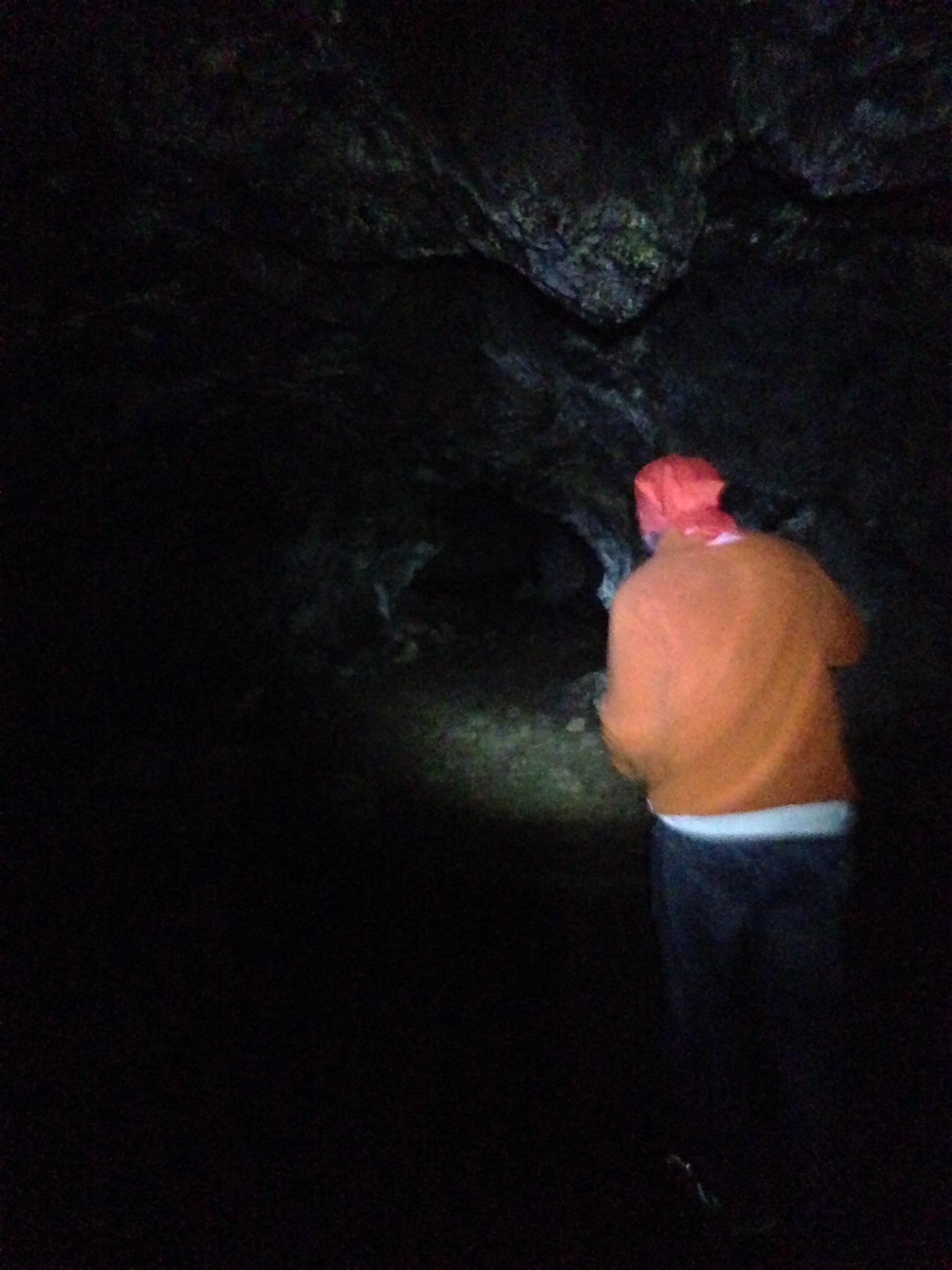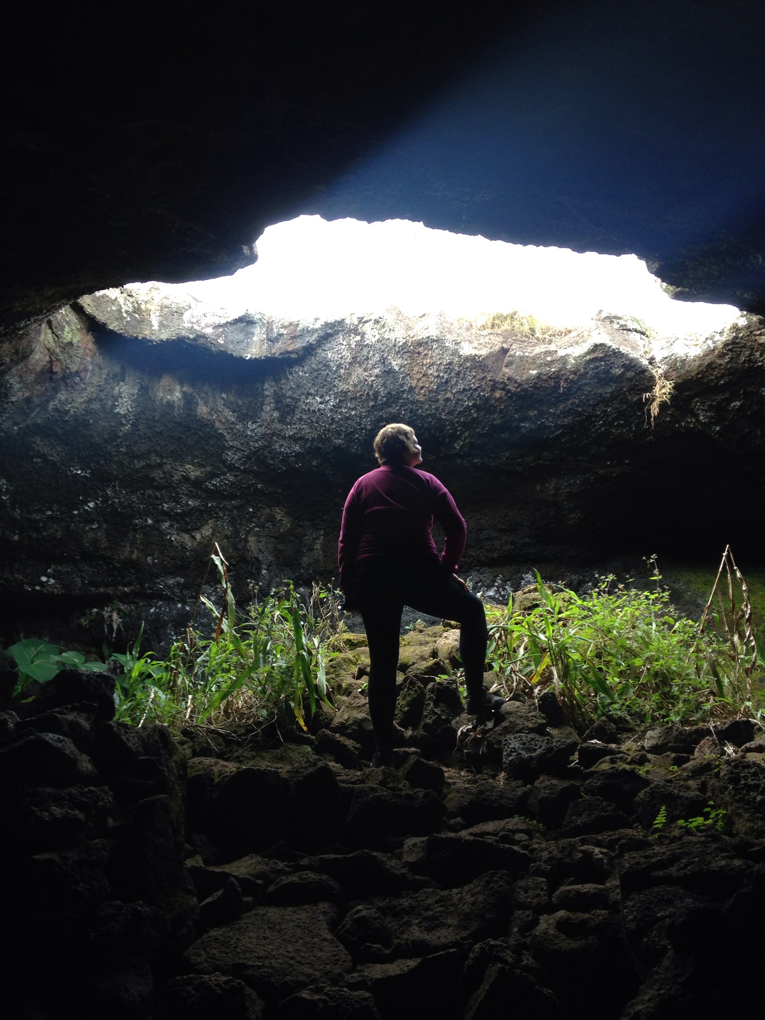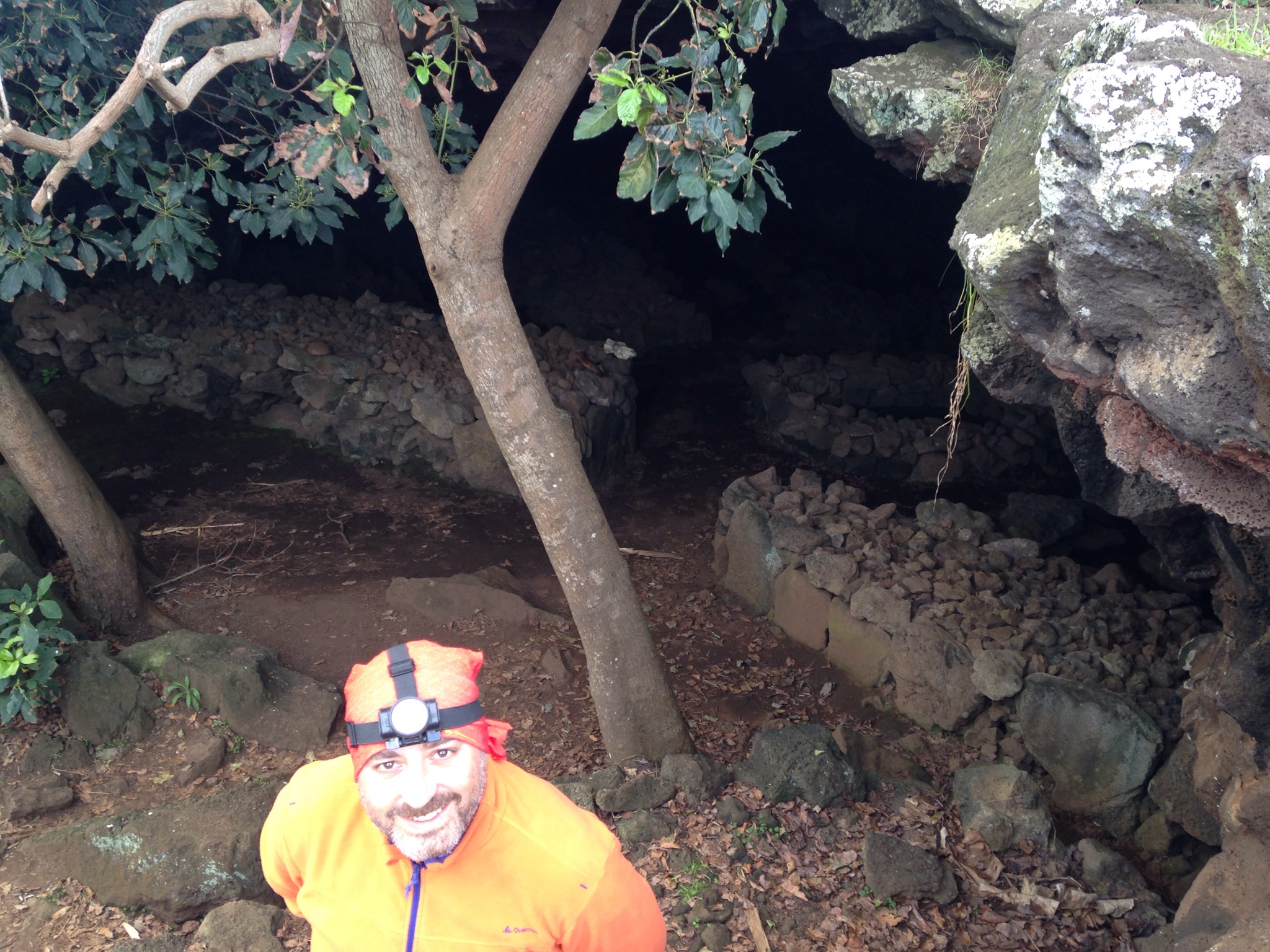 Seguimos hacia Ana Te Pahu y Ana Te Peu. La primera de ellas es la llamada normalmente cueva del plátano, una cueva donde habitaban los rapanuis de fácil acceso y que permite hacerte una idea bastante buena de como era la cosa. Al entrar en la cueva por los escalones si coges el camino de la derecha entras en una caverna bastante amplia que puedes recorrer como 500 metros pasando por dos aberturas superiores que iluminan un poco la cueva y luego continuando totalmente a oscuras. Caracola que es muy fan de su linterna de Scully (Expendiente X) que le regaló su jefe de ADIF que no funcionaba y luego resulta que es la mejor linterna del mundo. Un poco acojonados seguimos el camino y al final vislumbramos un poco de luz por donde efectivamente puedes volver a salir. Mención especial para la valentía de Caracola que hizo que siguiera porque yo estaba haciéndome el machote pero iba un poco asustado.