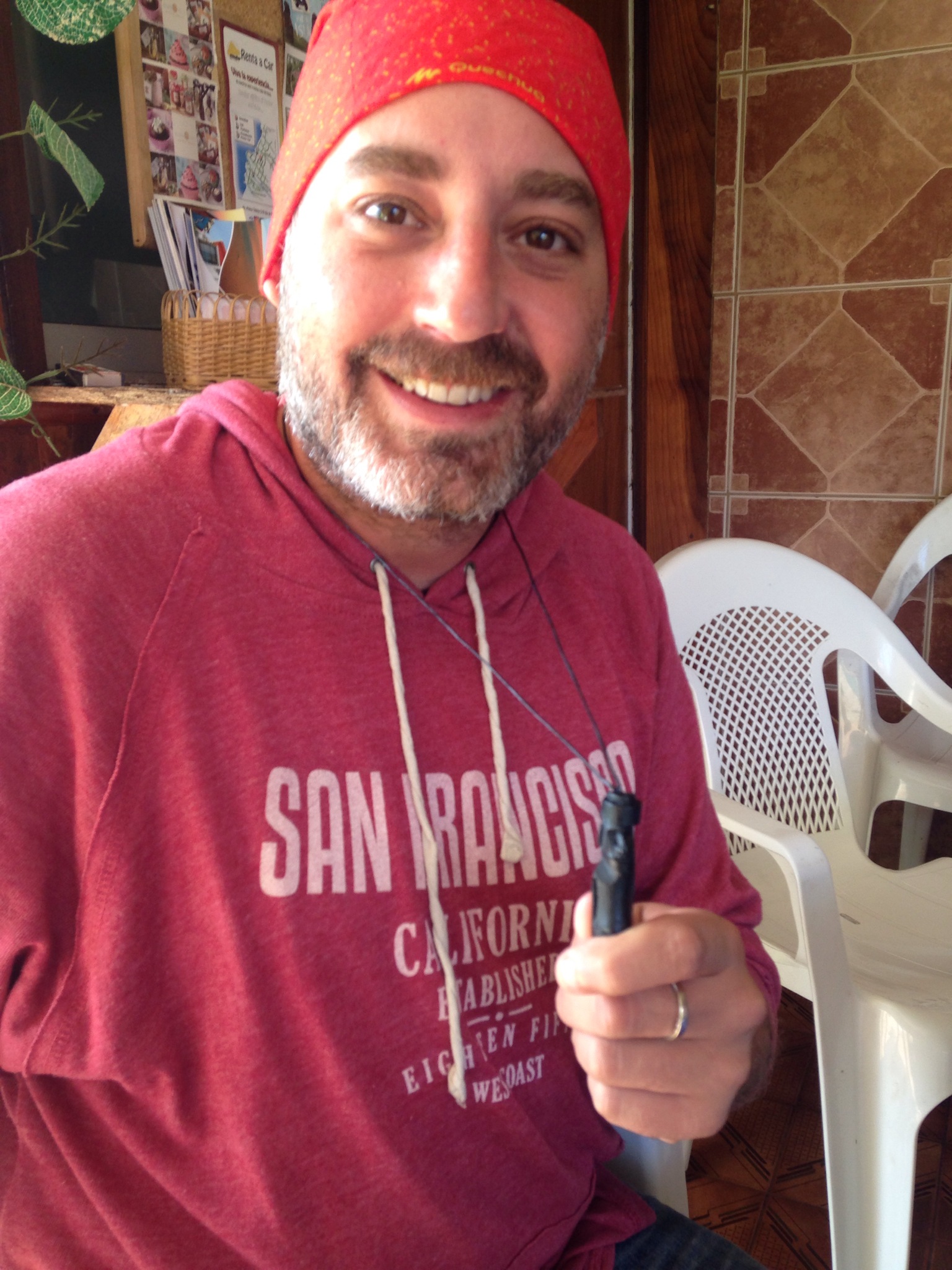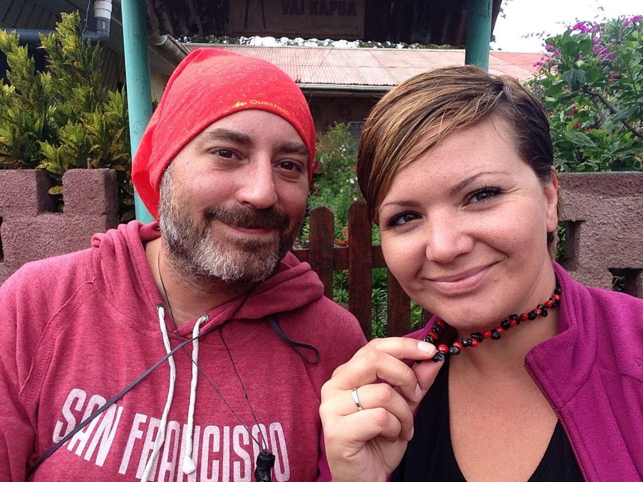 Antes de marchar nos hace un regalito (que apañá es!) un collar de semillas para mí y un colgante con un moai de madera para Oru! 😋
