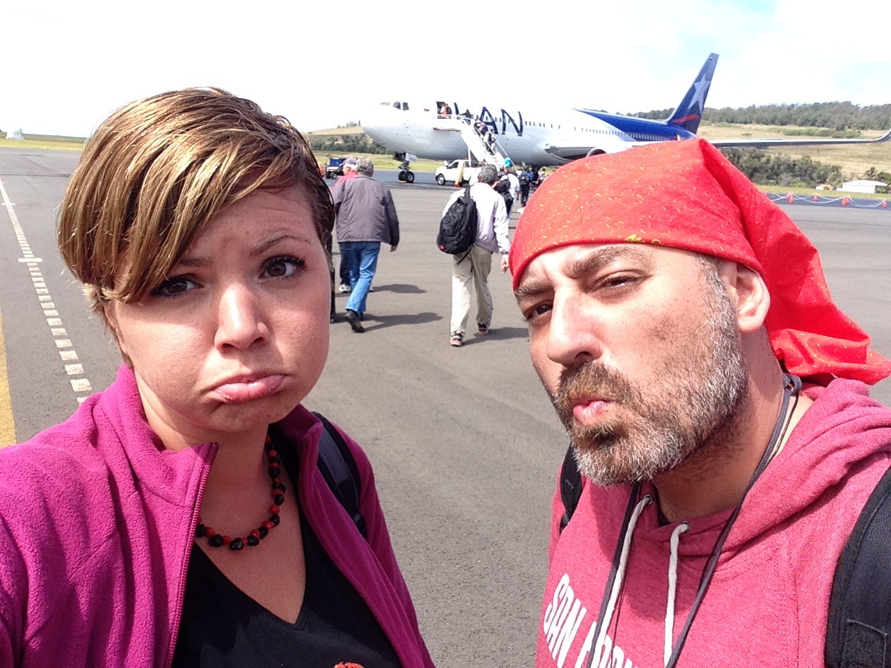 Como bien decía hace un par de dias, aunque compremos pasajes para dos normalmente viajamos 3, Oruga, Murphy y yo. Y esta vez Murphy se manifestó en forma de rapanui hombre, rapanuí mujer y sus tres vástagos…