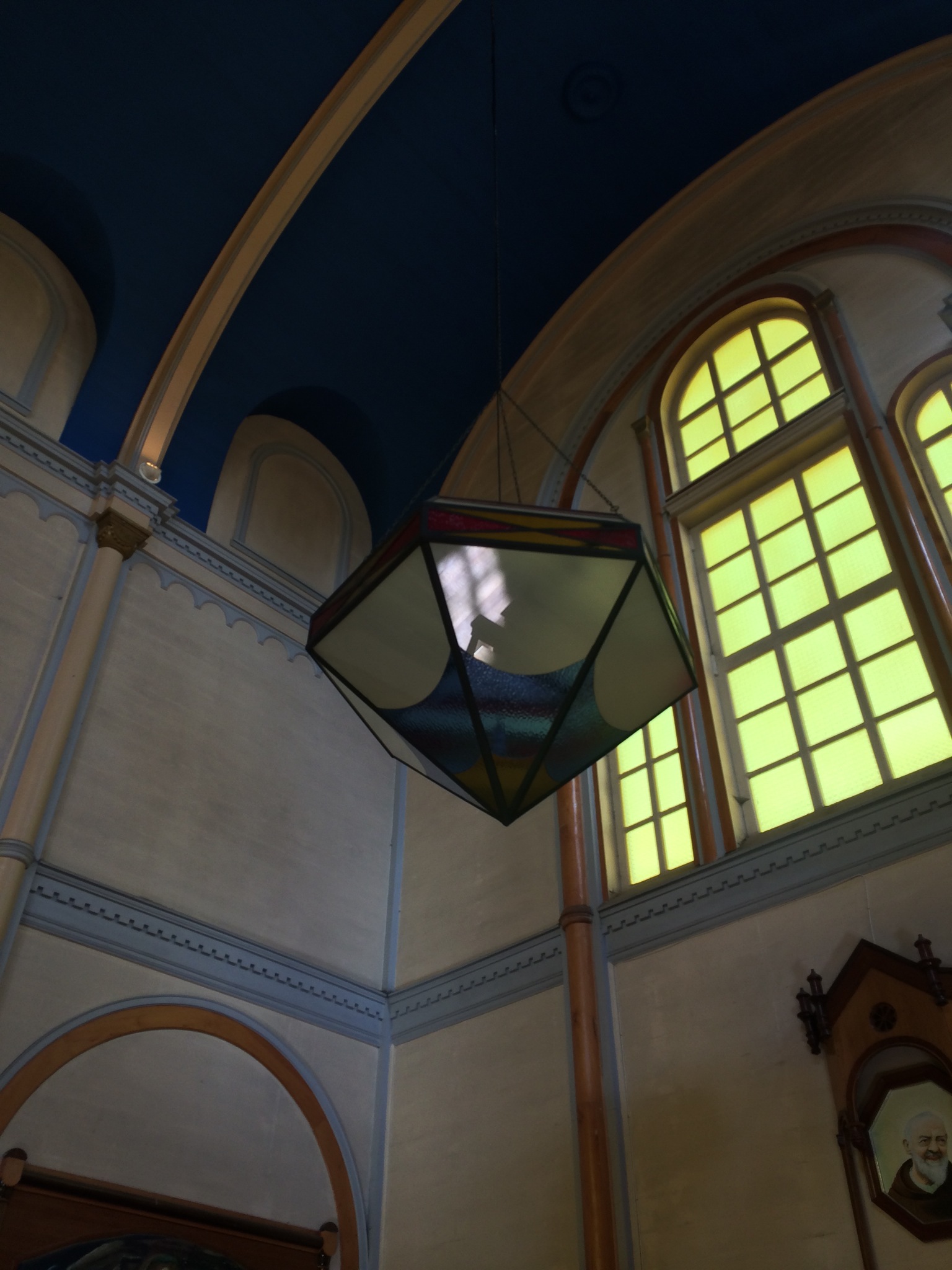 Empezamos desde nuestra calle, pues el circuito pasa por nuestra puerta, y de camino al centro nos cruzamos con la iglesia del Sagrado Corazón, una iglesia que bien podría estar en la Alemania más profunda y montañosa. De hecho es una réplica de un iglesia ubicada en la Selva Negra. Esta realizada en madera y fierro que son las placas que vimos el otro día en Castro que son como una mezcla de metal y madera.