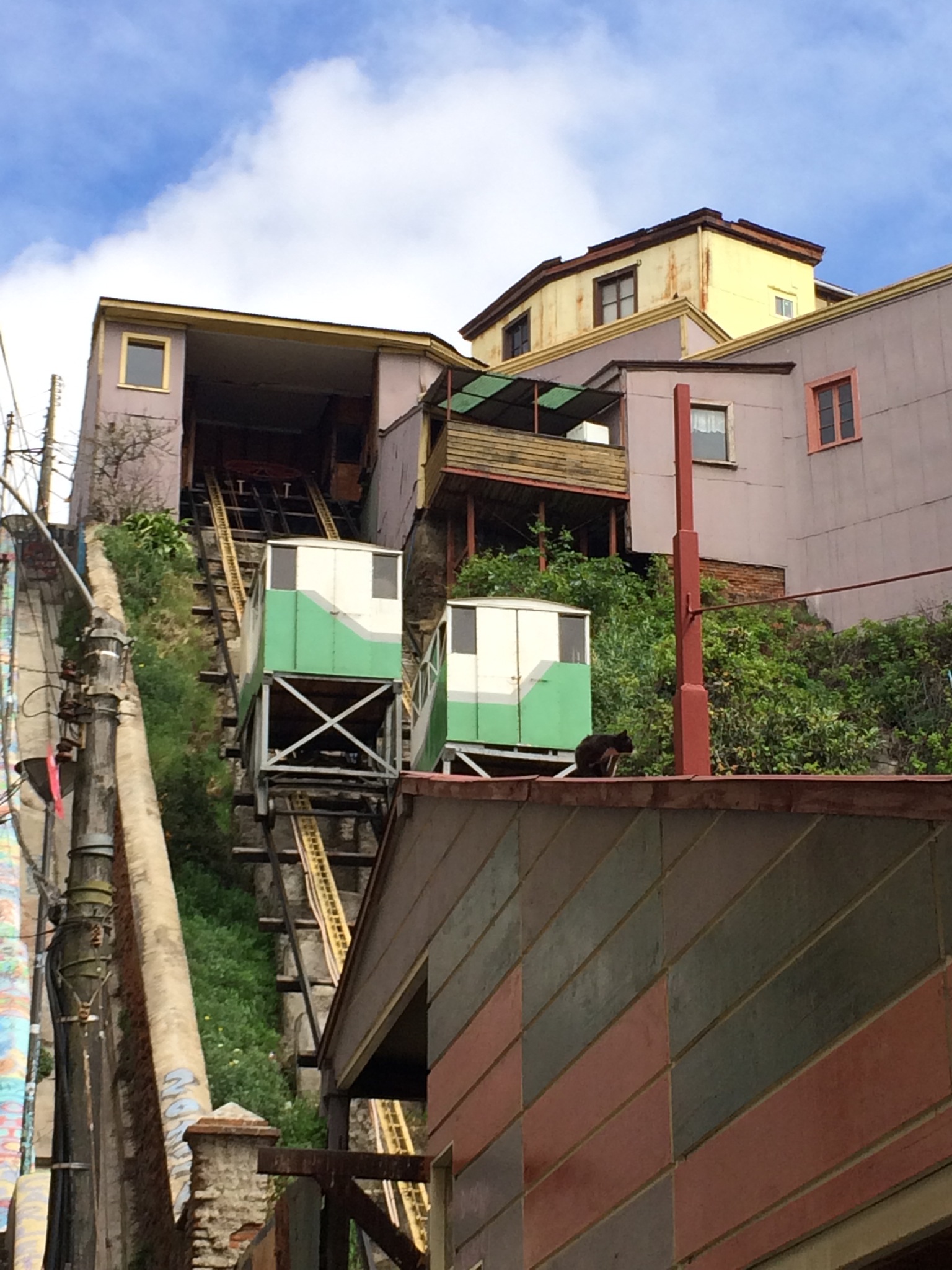 Para subir hasta los cerros más bajos (la parte de abajo de la montaña) hay repartidos por la ciudad varios ascensores que son en realidad funiculares de principios de siglo lo que les otorga un encanto. Nos recuerda al barrio Alto de Lisboa pero estos «ascensores» parecen bastante más empinados y por lo tanto necesario ;)