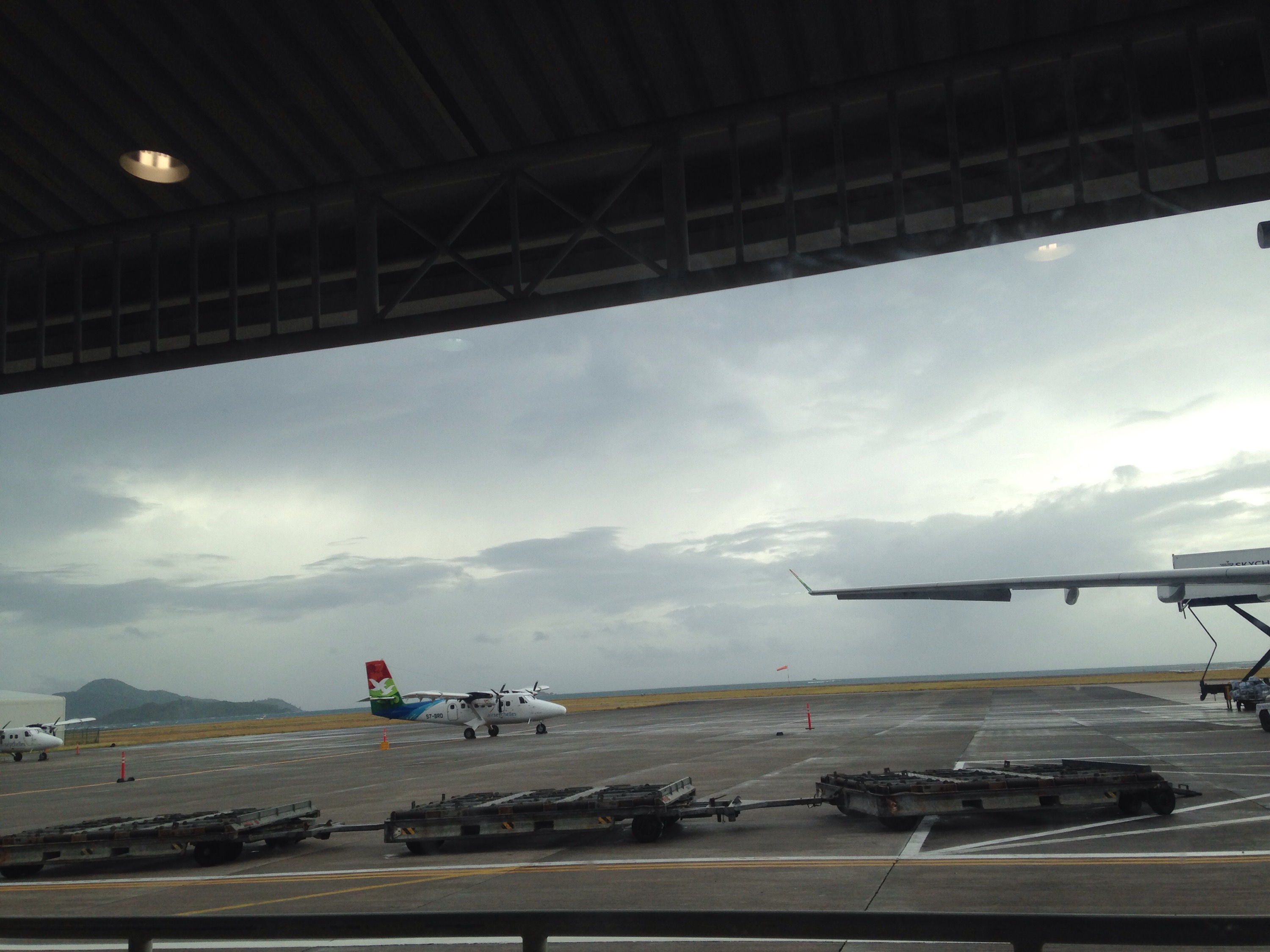 Para ser Seyshells el aeropuerto es un cagarro. Es pequeño, sucio, lento y oscuro. Nada mas bajar tienes que hacer la cola para el control de pasaportes, y esta se alarga hasta la zona de pistas.
