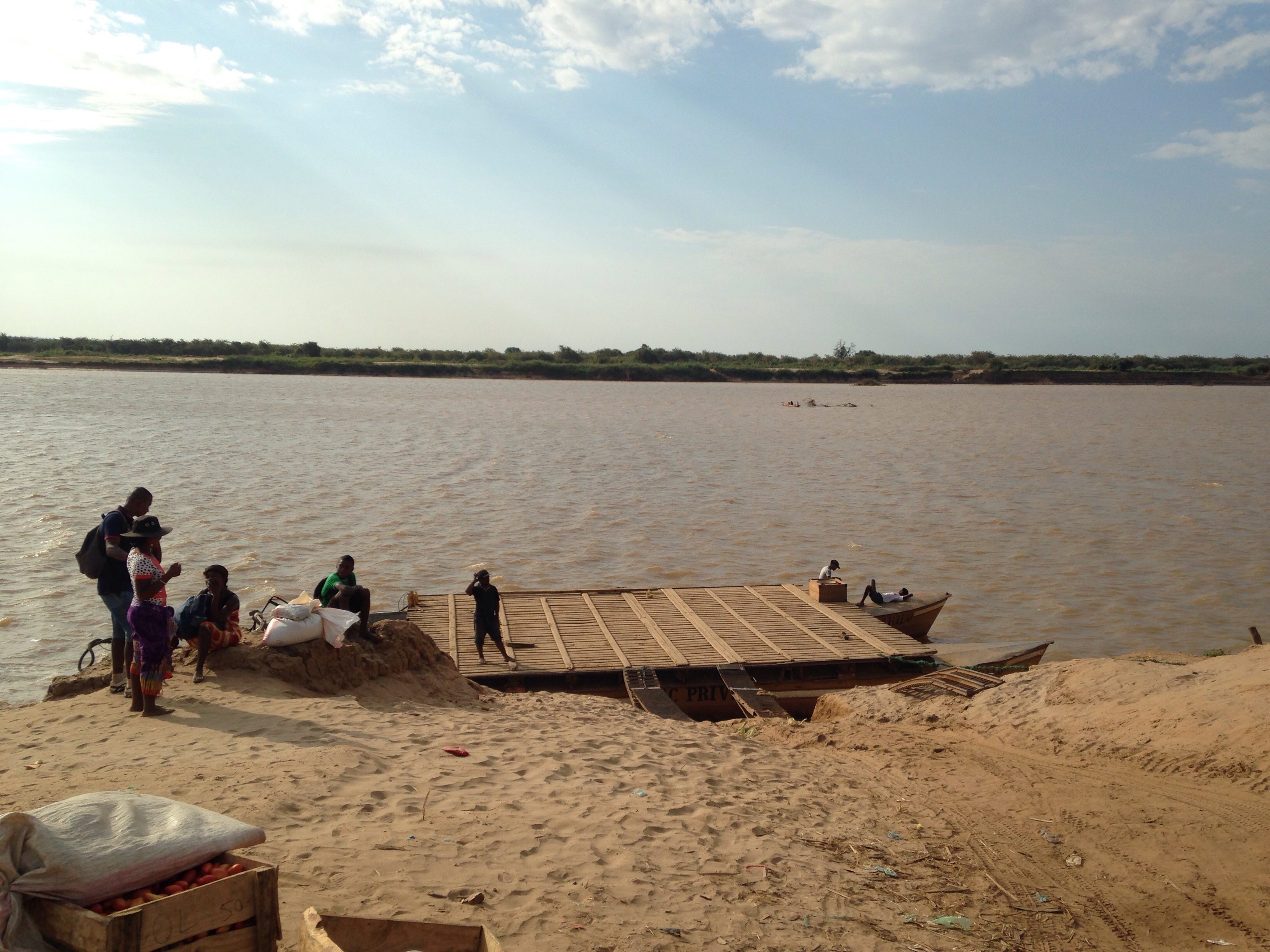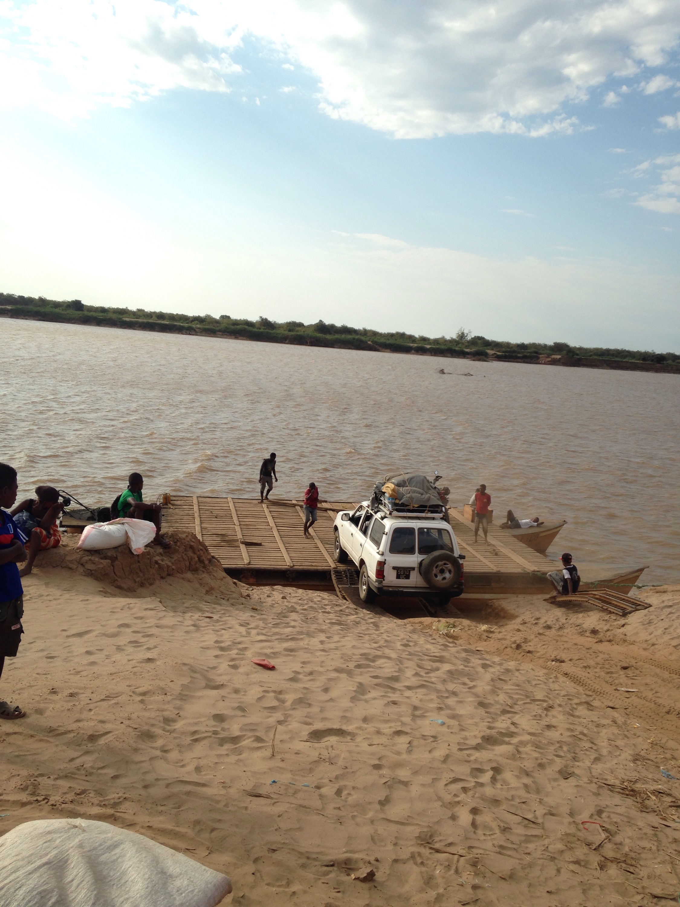 Tras pegar botes y más botes en la carretera llegamos al ferry que nos llevará a nuestro destino final tras 30 minutos de travesía. Expliquemos bien esto; el ferry como tal es un ferry tipo de los que vimos en Perú y Bolivia. Una barcaza donde se suben los coches y las personas sobre una superficie de madera agarrada a dos motores de los años 50 que hacen un ruido estrepitoso. Para subir al ferry el coche tiene que bajar una cuesta de arena bastante pronunciada y mediante dos escaleras de hierro que tienen pinta de pesar media tonelada cada una acceder a la barcaza. La tarea no se muestra muy fácil la verdad. Una vez subido el coche los pasajeros subimos rápidamente atravesando las mismas escaleras. Parece que nos vamos, cuando el barco empieza a moverse y a rotar sobre si mismo, pero no. Aparecen unas mujeres mayores como gritando para que paren y en lugar de echar marcha atrás s, giramos sobre nuestro propio eje y como ya no coincide con las pasarelas, para parar estampamos el barco contra los márgenes es del río que deben tener como 3 metros de altura. Ahora hace falta maniobrar y como parece que el barco no va marcha atrás unos 3 o 4 hombres empiezan a empujar el barco, literalmente hablando. ¡Todo el grupo está flipando!