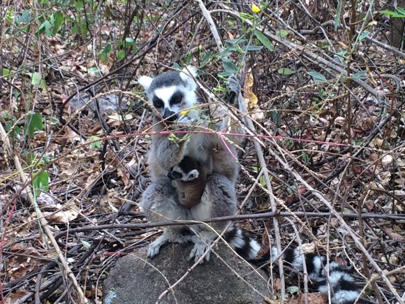 Otra de las mamis con la cría en la panzota se nos sienta en una roca casi al lado y podemos ver al baby lémur que no creo que se mas grande que la palma de mi mano.