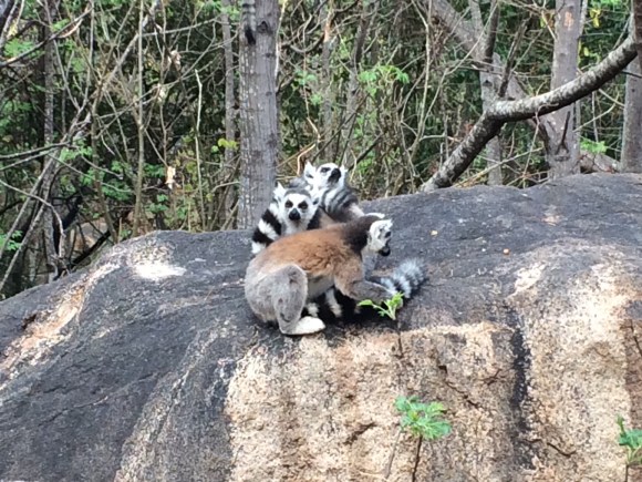 Viendo plantitas y pájaros seguimos adelante por un sendero que sin guía no se si se vería. Otra familia de lémures nos espera en unas rocas. Esta vez hay varias mamis que Sonrisitas nos muestra triunfal.