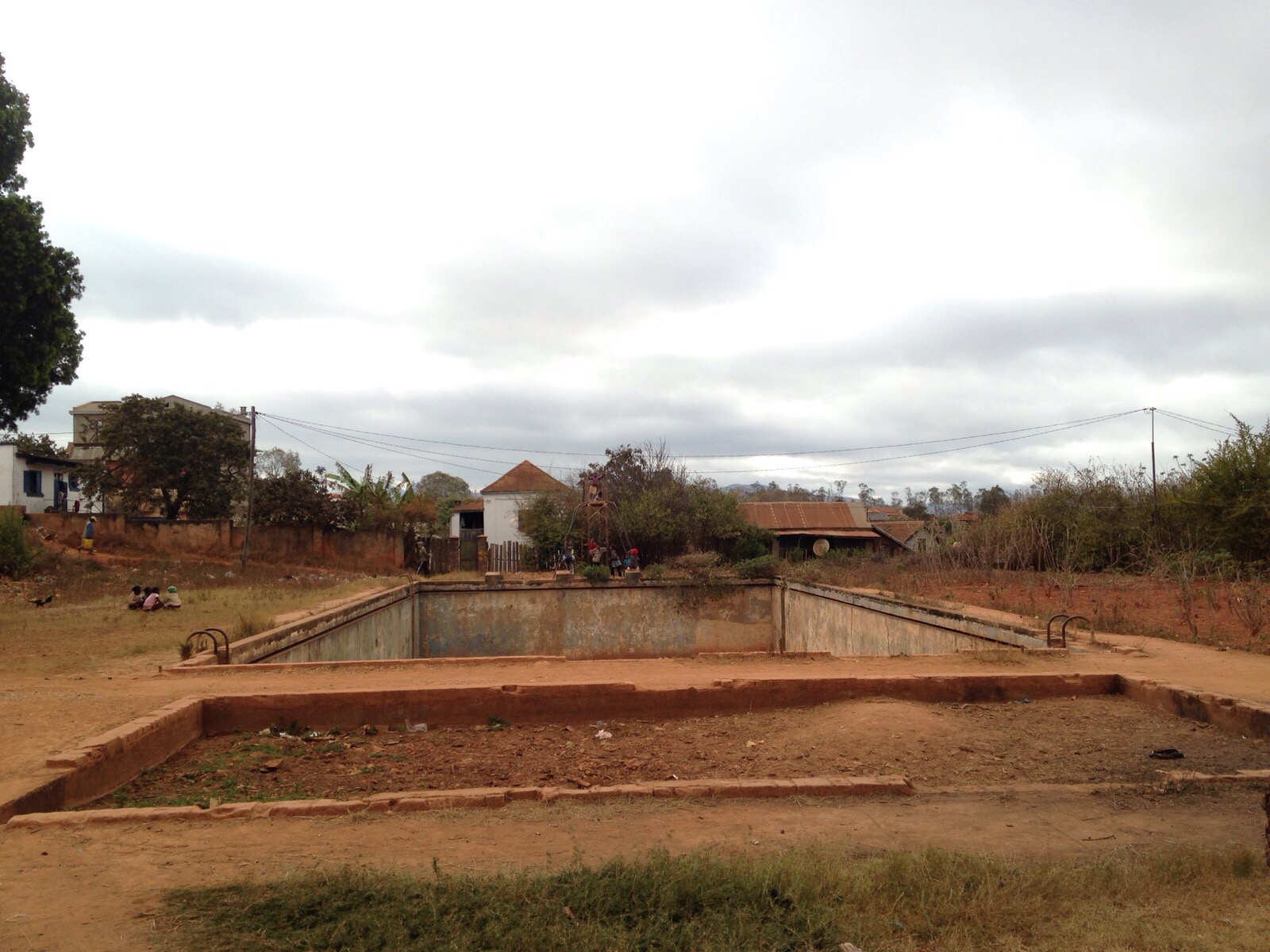 Mientras él acaba me acerco para ver a los niños jugar en la piscina. La piscina es de esas antiguas de obra, en un lado tendrá unos 5 metros de profundo y en el lado contrario 1m y aun mantiene en pie el trampolín de hierro.