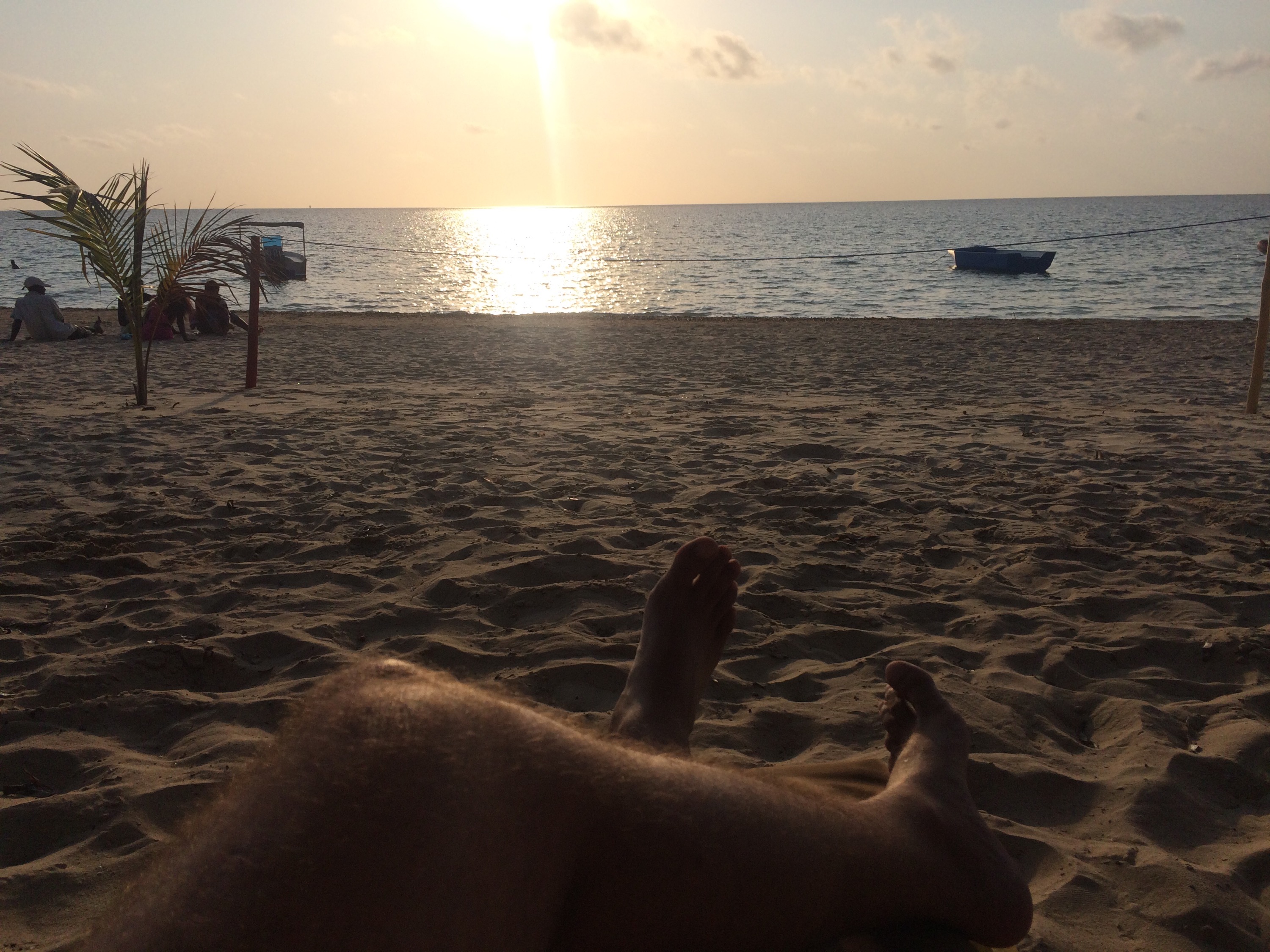 Volvemos a nuestra jaula de oro y allí nos ponemos a tomar el sol en las tumbonas que tenemos justo al lado y vemos como empieza a disolverse el grupo de vendedores. Pero no, no se disuelven sino que han buscado nuevas víctimas: dos tipos altos que pasean por la playa, con pinta de alemanes son ahora el nuevo objetivo de todos ellos. Podemos descansar ahora en nuestro paraíso particular.