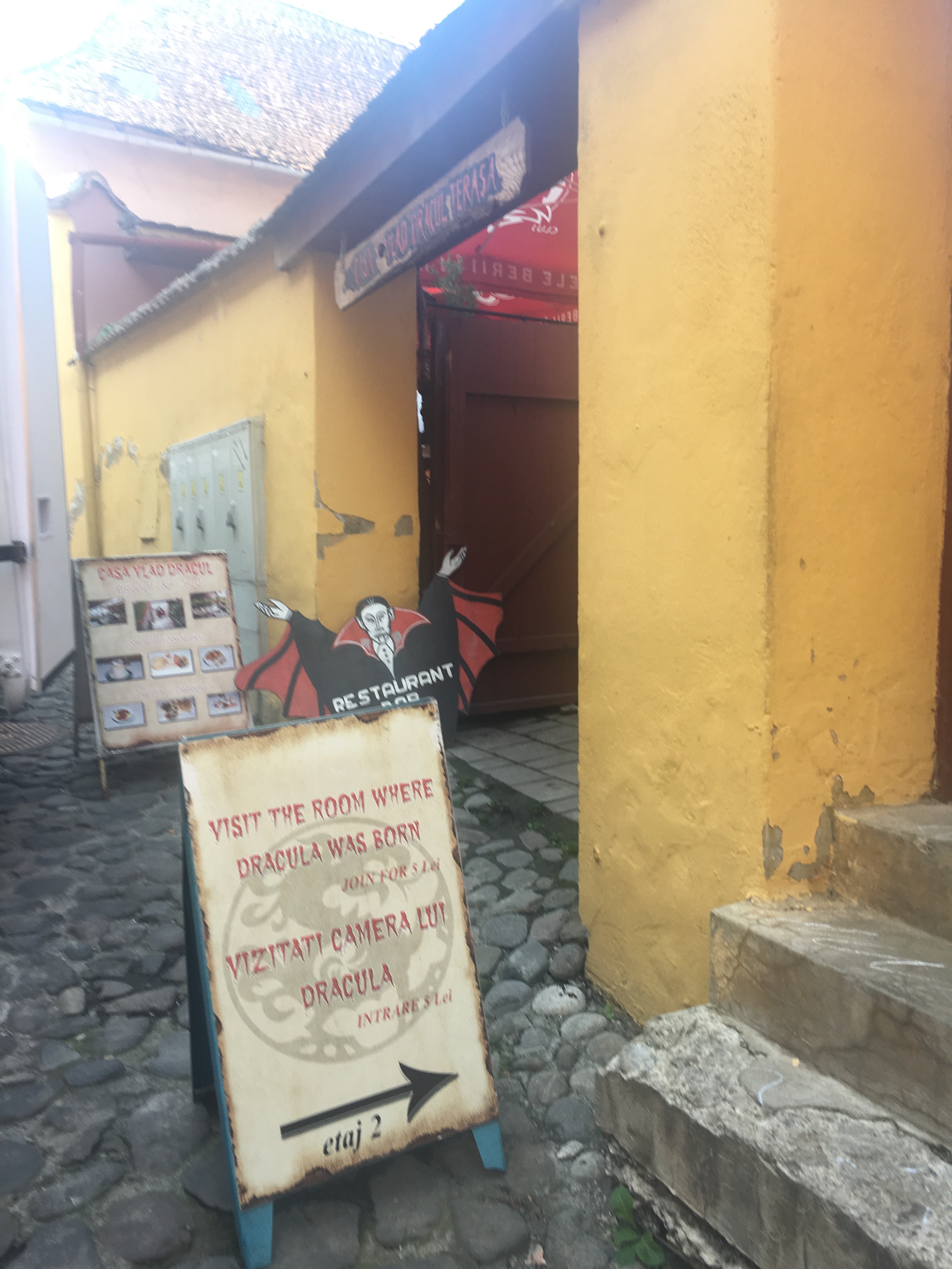 Subiendo la adoquinada calle pasamos justo delante del restaurante de Dracula, ubicado en la casa donde nació Vlad Tepes. El restaurante es un despropósito y roza el insulto en un pueblo tan ordenadamente antiguo y bonito. Si su propósito era que se viera desde lejos, lo han conseguido, desde luego. Pero si Mr. Tepes levantara la cabeza hubiera empalado uno a uno a los responsables de semejante esperpento.