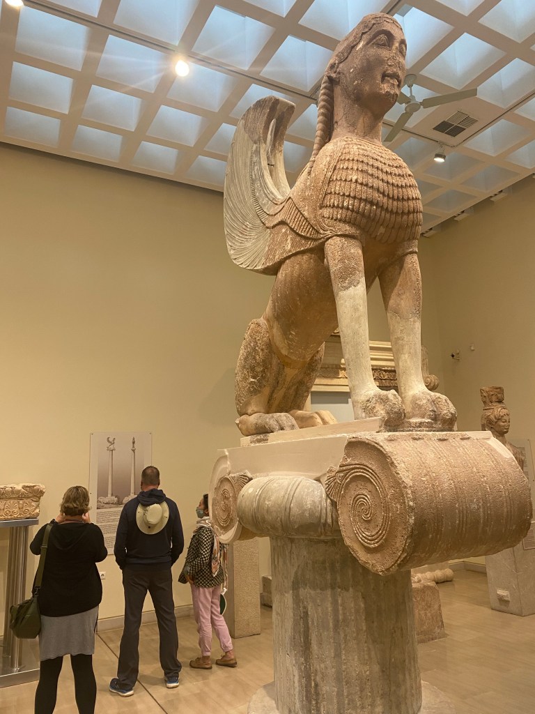 El museo no es demasiado grande y hay un montón de piezas del Oráculo y del conjunto arqueológico. Yo me quedo con la gran Esfinge de Naxos, adivinad quien la donó.. y es un mamotreto que no te entraría en el salón con cabeza de doncella, cuerpo de Leon y alas de pájaro. Originariamente estaba puesta en una columna Dórica así que en conjunto hablamos de una escultura de unos 13m. A mí para el jardín se me queda grande.. pero impresionar, impresiona un rato.