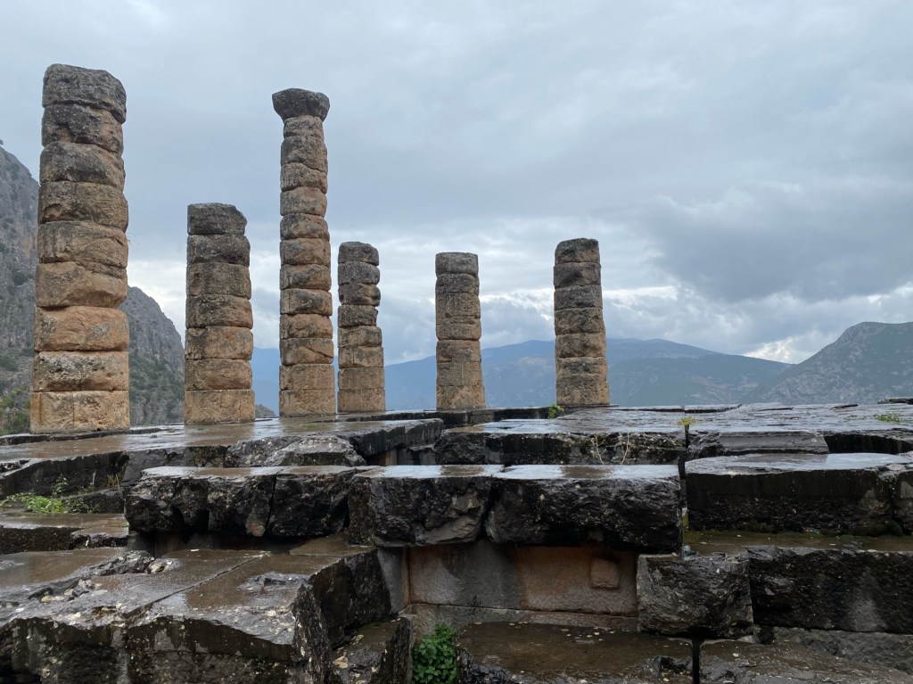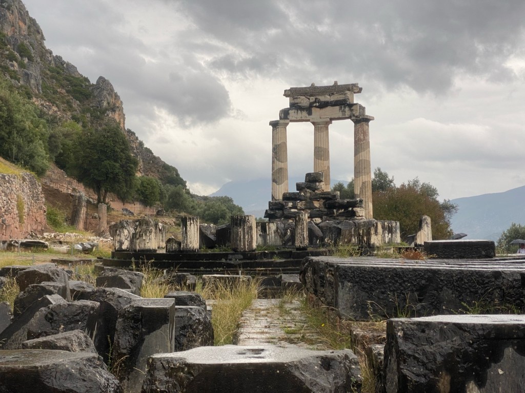 Del Santuario de Atenea Pronaia solo queda en pie el templo circular, con bastantes columnas en pie. La lluvia nos permite sacar unas fotos con el monte Parnaso al fondo y poner de nuevo camino a Tetis, porque vemos la niebla al fondo y esto se está empezando a poner feo..