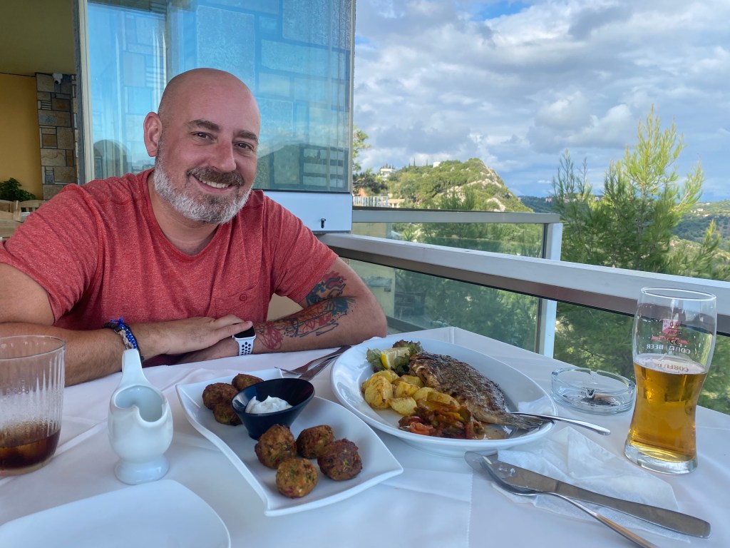 En contra de todo pronóstico comemos como reyes, pero de los buenos, no como “la Leti” que tiene pinta de ser respiracionista. Nos zampamos una dorada, una mega ensalada con tropecientasmil cosas y unas croquetas de verduras y queso, que ya habíamos probado, pero estás están mucho más ricas y menos fritangosas. Esperamos pringar en la cuenta como dos guiris pagando además de la buena comida y la bebida, las vistas. Nuestra sorpresa viene cuando nos traen 37€ de cuenta. ¡Esto lo haces en Almuñecar y menos de 70€ no pagas!