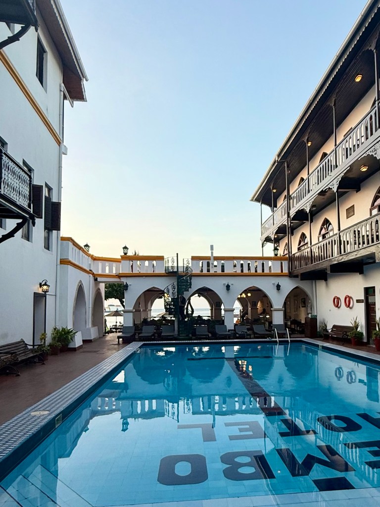 El hotel es, en una palabra, espectacular. Un hotel antiguo totalmente restaurado y decorado para sentirte en el Rick’s Café de Casablanca. El centro lo ocupa una espectacular piscina rodeada por las habitaciones a tres alturas, como si de un riadh se tratase. Al fondo, el acceso a la playa donde unos chavales están haciendo piruetas y los vendedores de pareos se amontonan para enseñar el material a los turistas que disfrutan, tras el cordón del hotel, de bebidas frescas sin alcohol. Y es que, Zanzíbar a diferencia de Tanganica tiene mayoría musulmana.